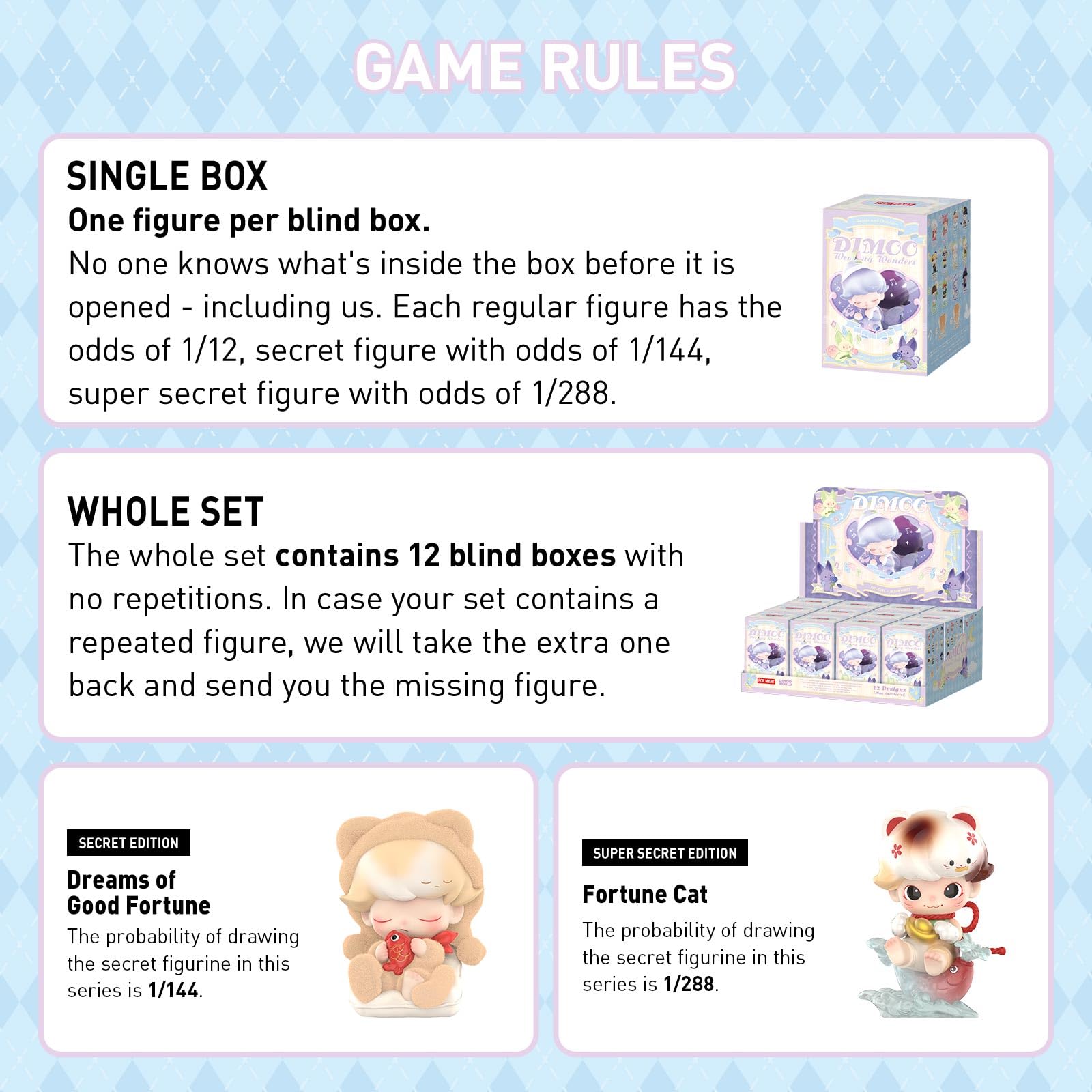 • Random Design: Blind boxes are fully random and we cannot accept requests for specific items. There chances of getting the secret edition are usually 1/288. When purchasing the whole set, there will be no duplicates figures.