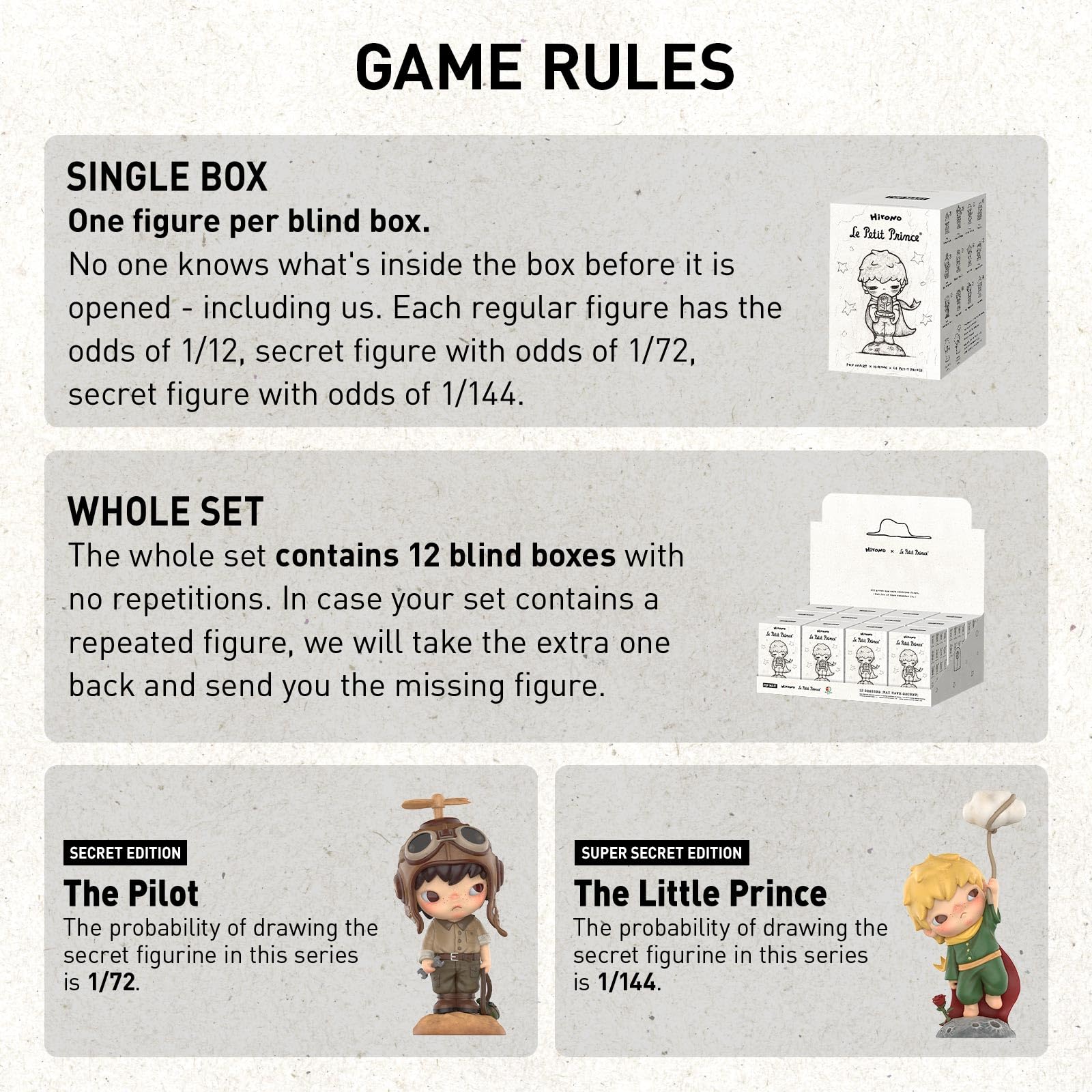 • Hirono×Le Petit Prince Series Figures: The blind box contains a random figure from a specific series. Each blind box only contains one figure. No one, including us, knows what's inside. This collection contains 12 blind box figures, one of them might be the secret edition.